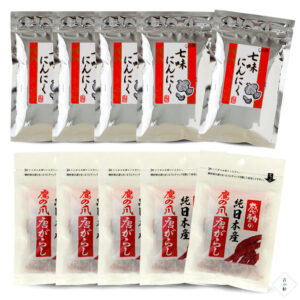 【七味にんにく】唐辛子(中国産)、陳皮、にんにく、ごま、青サ、麻の実、けしの実