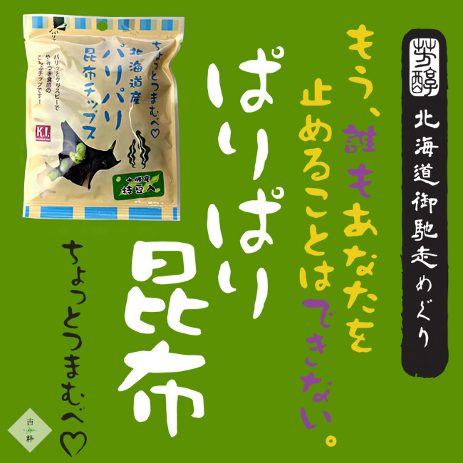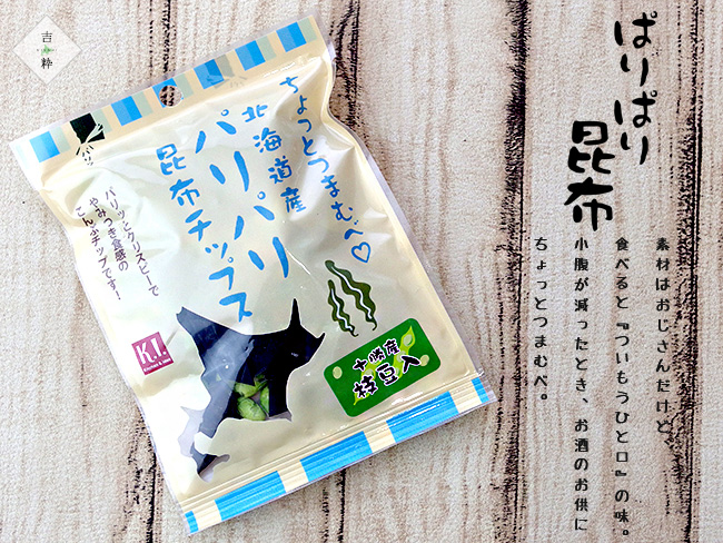 北海道産の昆布と北海道十勝産枝豆を乾燥させてオヤツにした【ぱりぱり昆布と十勝産枝豆】です。普通のおやつ昆布以上に「パリンッ」とした軽くて美味しい食感と、十勝産にこだわったフリーズドライ塩枝豆で飽きのこない味に仕上げました。