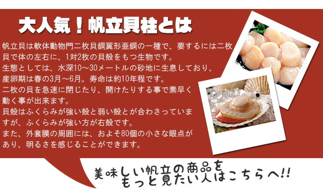 オホーツク紋別の流水の海で育ち、大自然の旨みの帆立貝柱を使用しました。バターやサラダ油などで加熱調理してお召し上がりください。