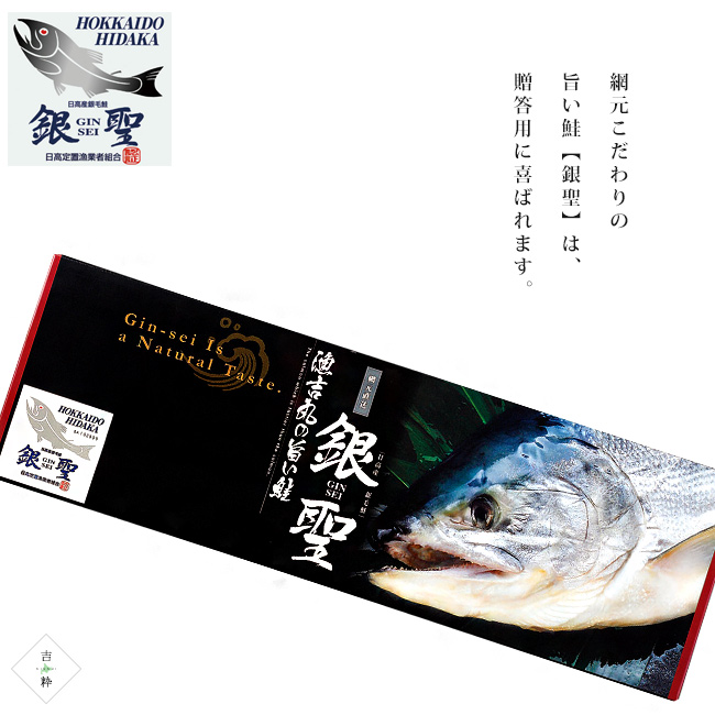 『銀聖』というブランドは日高定置漁業者組合が名称とキャラクターを募集し、多数の応募の中から『銀聖』という名前と銀色に輝く力強い鮭の姿をキャラクターとして選抜しました。この名前とキャラクターを含む認証ラベルは商標登録されており、このラベルが無いものは、日高沖で漁獲された鮭だとしても『銀聖』ではありません。