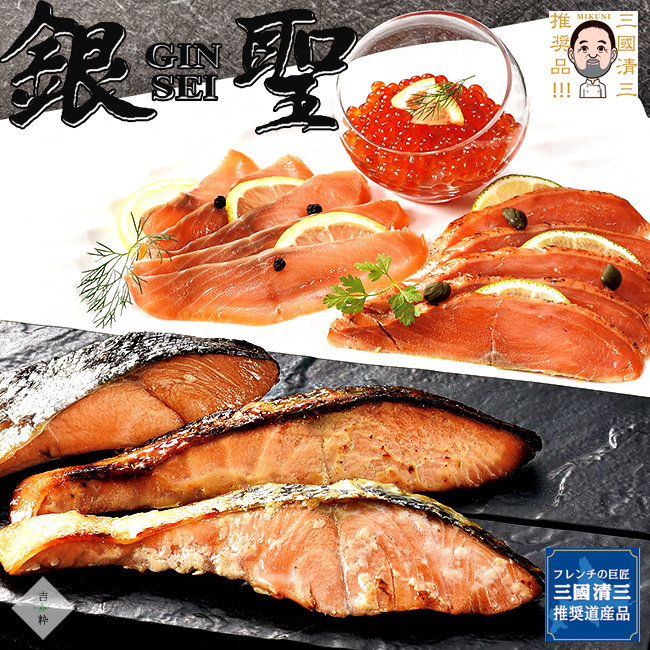 銀聖 (三國清三推奨道産品) 漁吉丸の銀聖詰合せギフト 銀聖焼漬し 塩麹焼き 大豆味噌焼き スモークサーモン 炙り焼き いくら醤油漬け フレンチの巨匠三國推奨