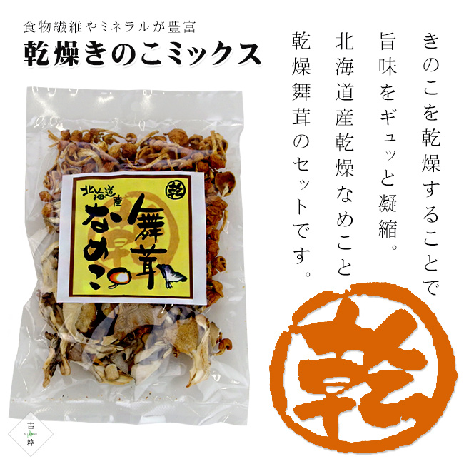 北海道産乾燥舞茸と、北海道産乾燥なめこのお徳なセットです。きのこは、食物繊維やミネラルなどの栄養素を豊富に含んだ低カロリー食品です。最近では、健康志向の高まりなどとも相まって、注目されている食材のひとつです。